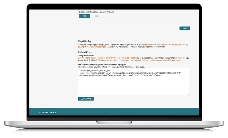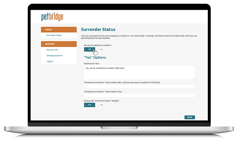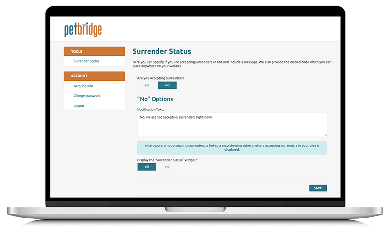 Be sure to quickly login and update whether your shelter or rescue is accepting surrenders on-the-fly. This will keep pet owners visiting your website informed, and update your status on the PetBridge Surrender Status Map!